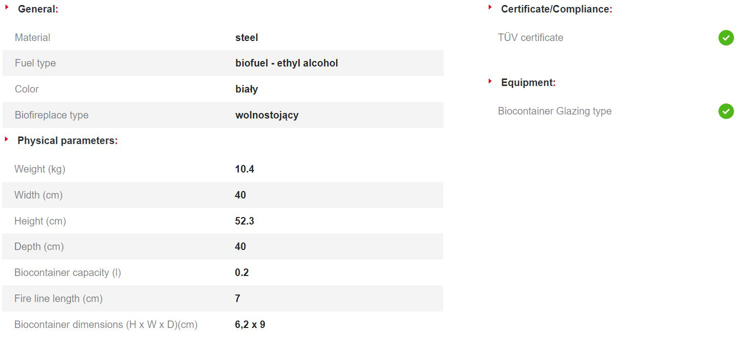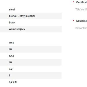 Διαθέτει καυστήρα βιοαιθανόλης με χωρητικότητα βιοκαυσίμου 200 mL, μήκος φλόγας 7 cm και πιστοποίηση ασφάλειας TÜV.